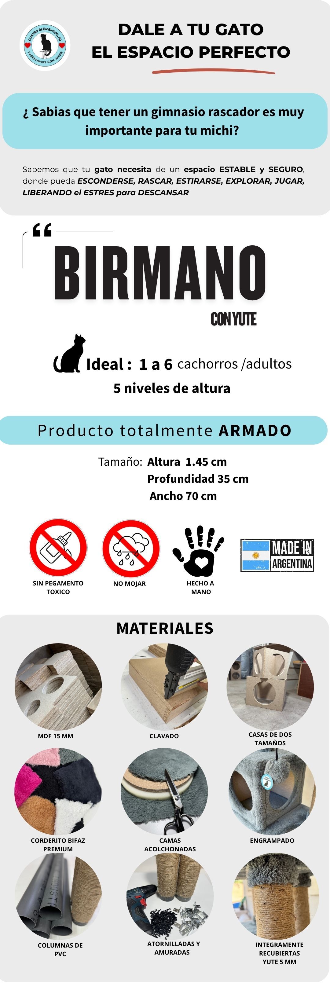 Creamos espacios únicos, indispensables para el bienestar de tus gatos. Cada pieza es creada con dedicación y artesanalmente, cuidando cada detalle, para brindarles a tus michis un espacio estable, robusto, firme y seguro, para que puedan rascar,estirarse, explorar, jugar y descansar, respetando su naturaleza y la deco de tu hogar. Todos nuestros gimnasios rascadores están diseñados y producidos por nosotros en Gral Rodriguez, provincia de Buenos Aires, Argentina, utilizando materiales premium de ALTA CALIDAD, por eso, cada día más humanos nos eligen. Pensá en la combinación de colores que más te guste, te lo fabricamos y lo despachamos lo antes posible; No te preocupes tenemos envíos gratis a todo el país gratis Ahora sí, dónde lo vas a poner para que tus michis lo disfruten ? ¡Te llega totalmente armado ! Gracias por elegirnos, Esperamos tus fotos y videos, queremos conocerlos